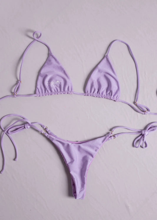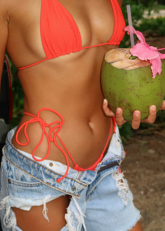 AMY WEARS THE SCULPT BIKINI TOP. AMBER V THONG. KAIA FLUTTER SKIRT