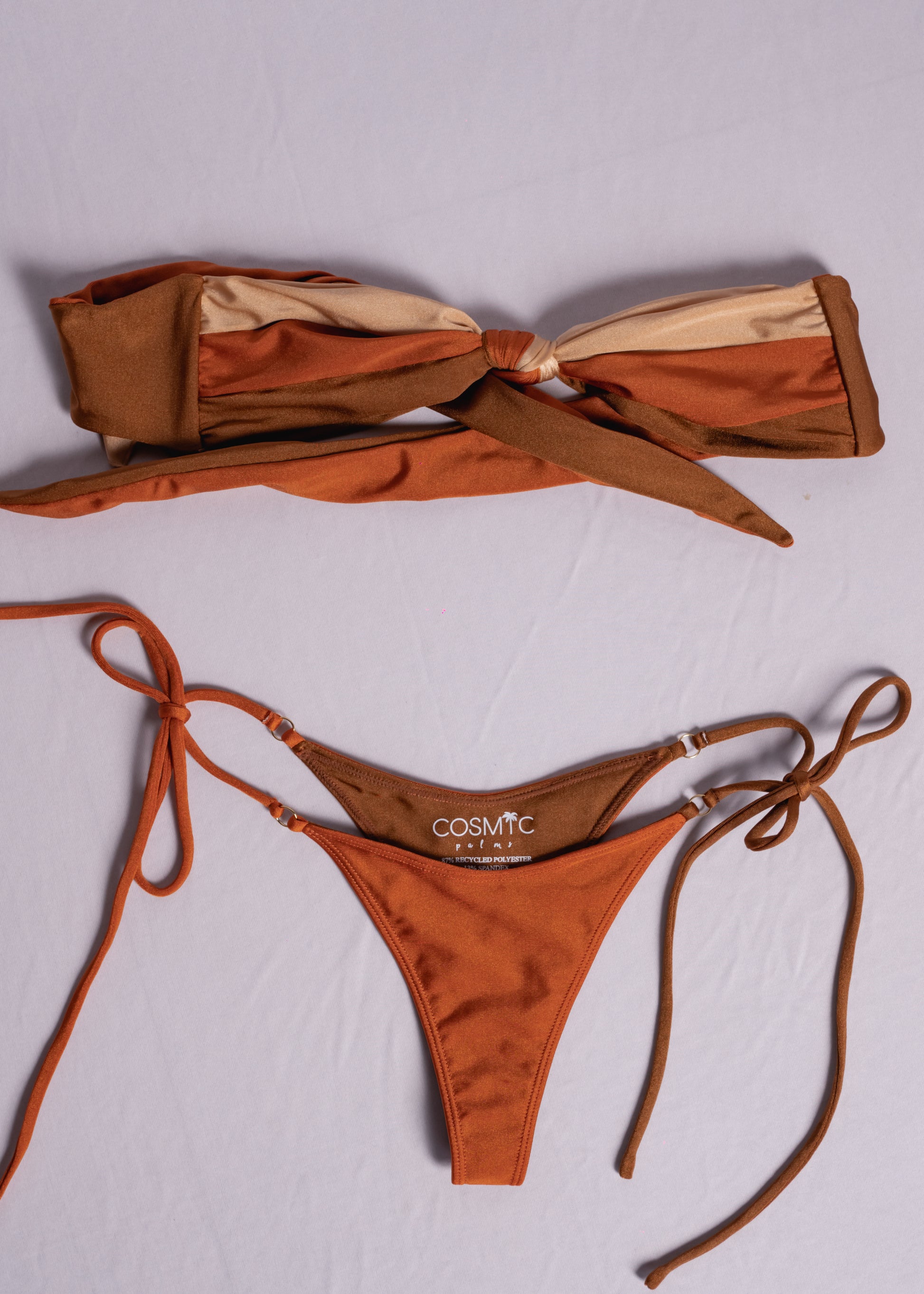 The Bibi Top features a strapless bandeau top, charming tie-back and front knot with attention to detail in the twist of color. Featuring a blend of 3 shimmering fabrics, cinnamon brown, classic nude and rustic orange.
