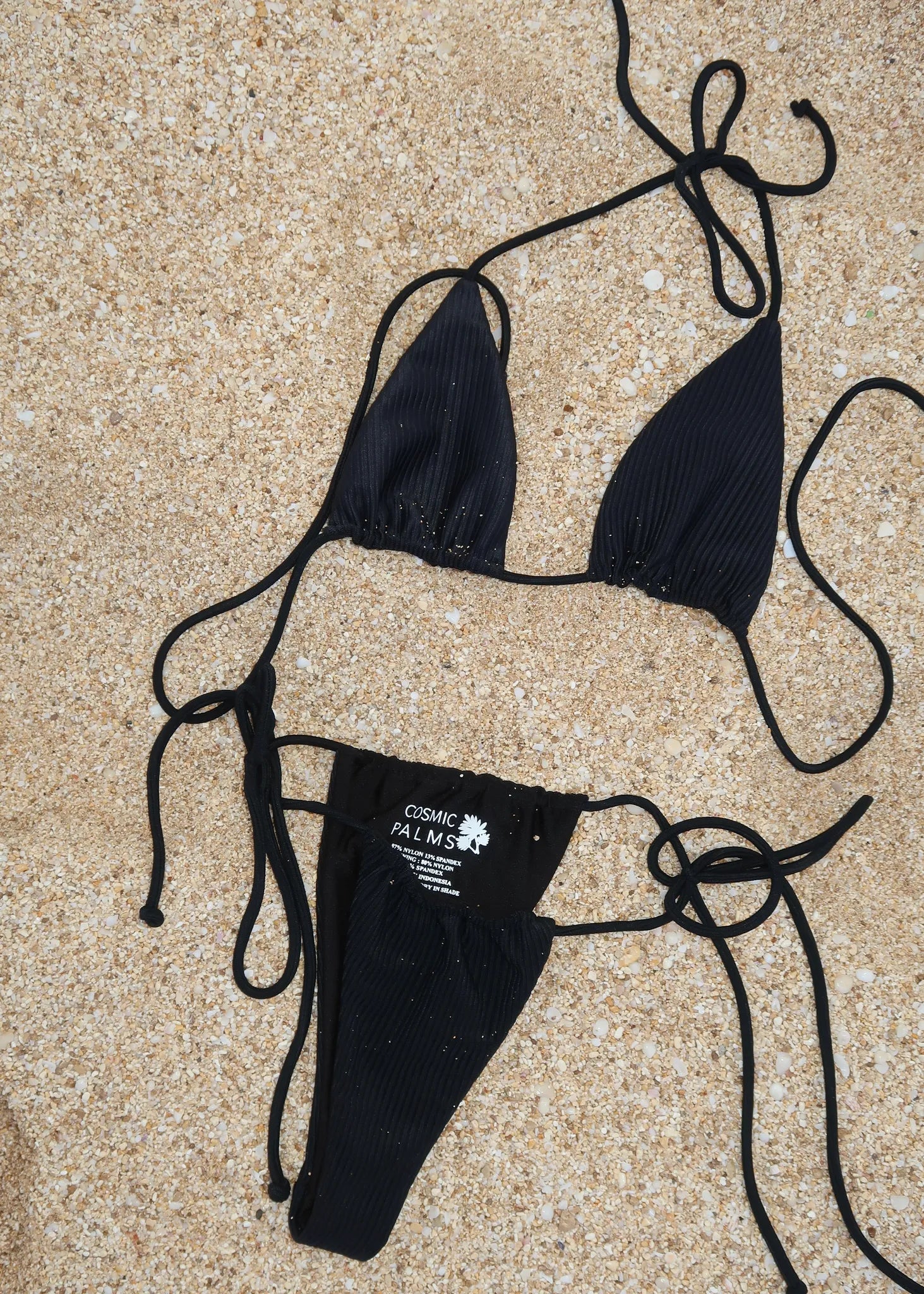 Designed to enhance your sun-kissed glow, this bikini features a sleek and minimalistic design, with adjustable, thin tie straps and a cheeky cut.